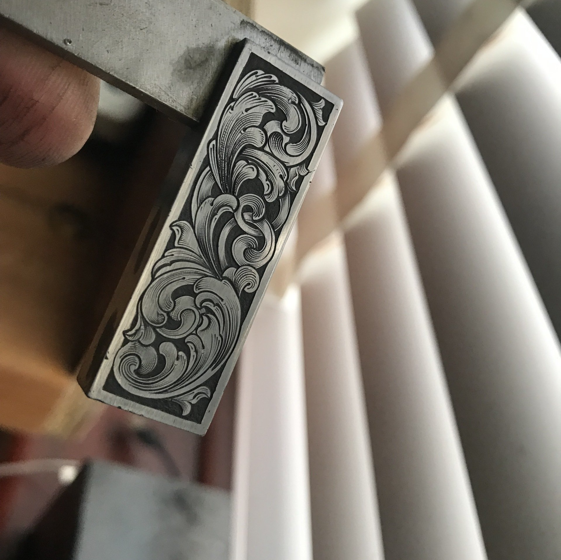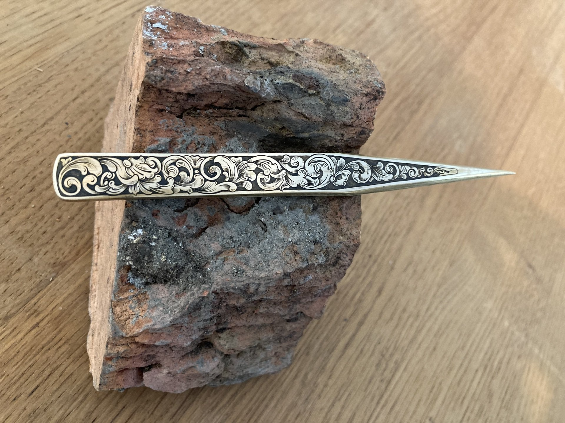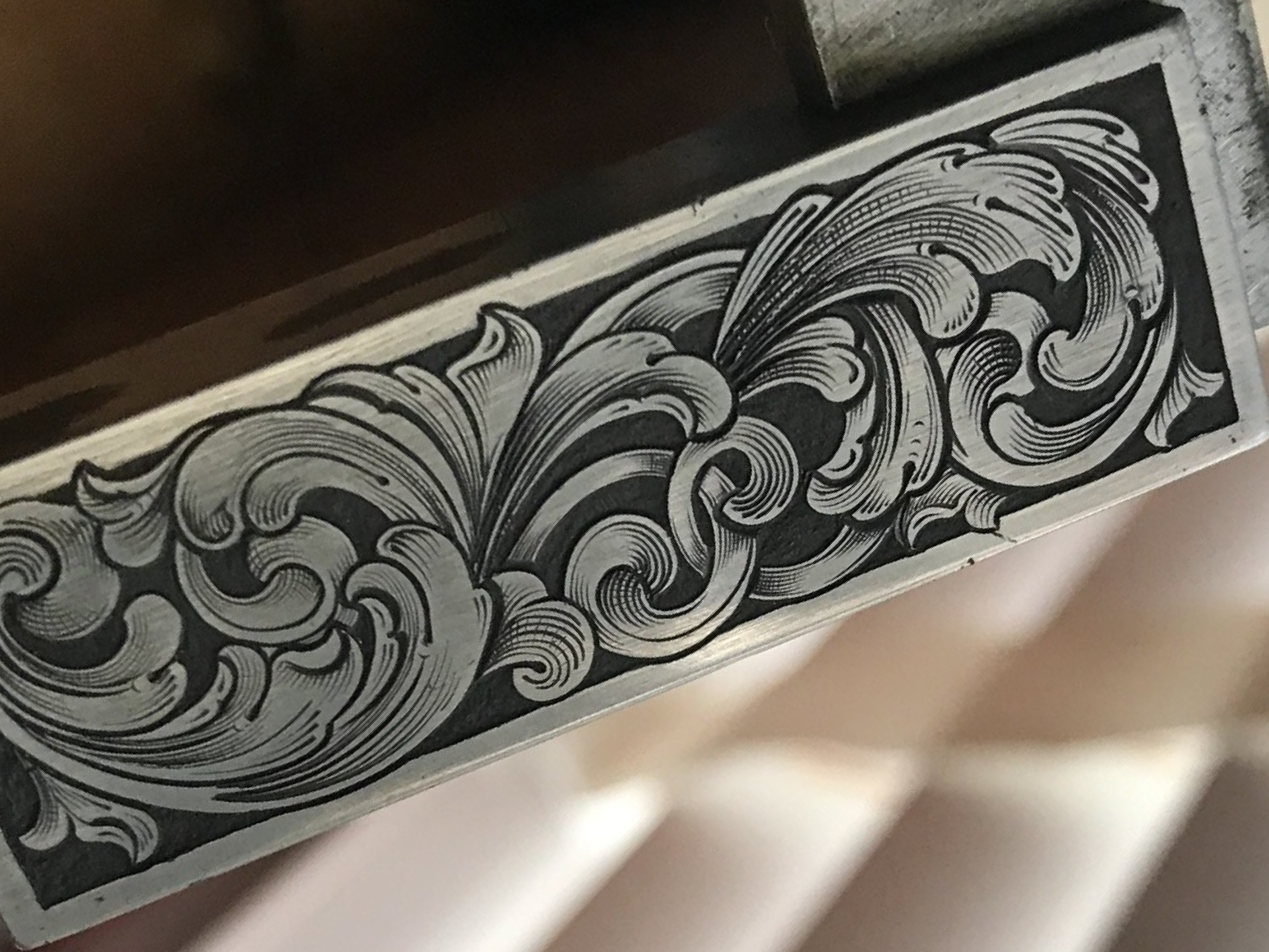 Just wanted to say a huge thankyou for the beautiful engraving that you done on my grandads ornamental penknife .The detail of the scroll work is absolutely breathtakingly .The craftsmanship is incredible and in this day and age of mass produced manufacturing it is a pleasure to find someone that still has the talent and skills to do this type engraving by hand. I look forward sending you more pieces to engrave for me. Truly thankfully.