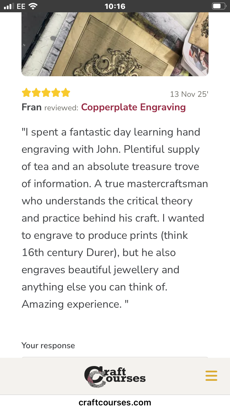 "I had such an amazing time learning from John. I 100% recommend this course to anyone interested in starting hand engraving. I now have the confidence to practice on my own and implement everything I learned onto rings and pendants for my jewellery business. "